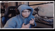 Osrsfeby Feby in a blue hoodie and headphones, sitting in a gaming chair with a wave painting behind him.