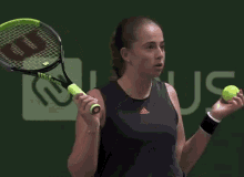 Jelena Ostapenko looking shocked on the tennis court, holding a racket and ball.