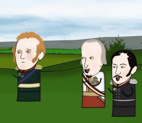 Oversimplified cartoon of historical figures discussing a genius, likely Napoleon Bonaparte.