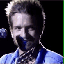 Pablo Alborán performing live, singing into a microphone while playing his guitar.