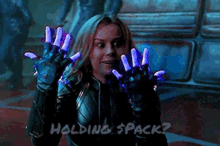 Captain Marvel shows off her glowing 'Diamond Hands' in a meme about holding $PACK, embodying the 'Wolf Pack' spirit.