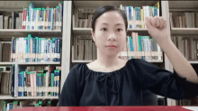 A woman demonstrates the 'Padam Kata' sign language gesture in a library setting, holding her fist up.