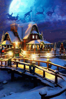 Santa Claus and his reindeer fly over a festive, snow-covered house on Christmas Eve.