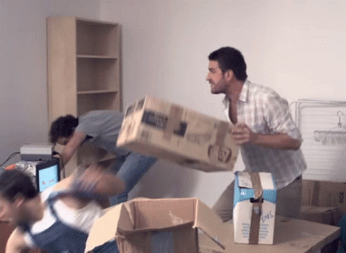 Palmashow members frantically move boxes in a chaotic and rushed moving day scenario.