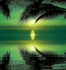 A breathtaking tropical sunset paints the sky and ocean in vibrant green and yellow hues, framed by palm trees.