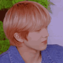 Park Jisung of NCT Dream with pink hair, wearing a denim jacket, looking to the side.