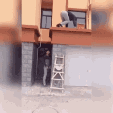 A man climbs onto a building ledge while another person pranks him by moving the ladder away.