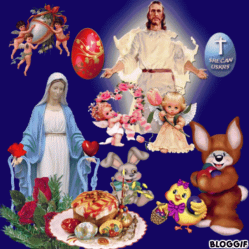 Animated Easter compilation featuring bunnies, angels, Jesus, Mary, and colorful Easter eggs.