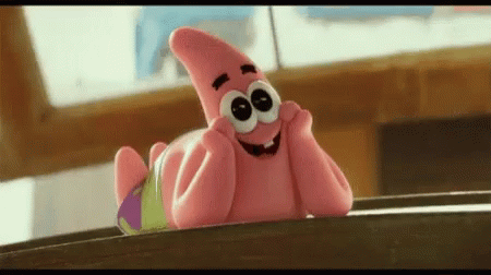 Patricio, also known as Patrick Star from Spongebob Squarepants, looks happy and amazed.