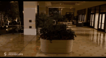 Paul Blart dramatically falls to the ground in a hotel lobby, landing near a large potted plant.