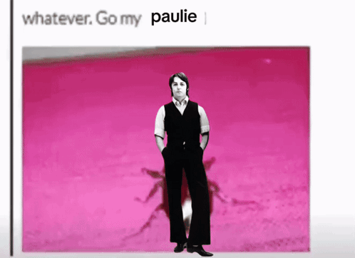Paul McCartney cutout slides across surfaces with a beetle, accompanied by 'whatever. Go my paulie' text.