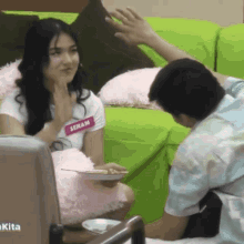 PBB housemates Seham Daghlas and Zach Guerrero share a friendly high-five on a green couch.