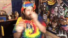 A man in a vibrant tie-dye shirt and Betty Boop hat gestures energetically in his Pcc1 Vlog.