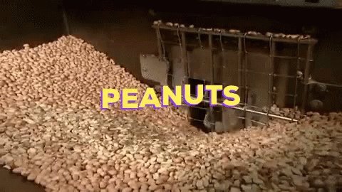 A large quantity of peanuts being processed in a factory setting, with the word 'PEANUTS' overlaid.