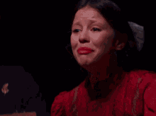 Mia Goth as Pearl in a red dress, crying and screaming intensely with her mouth wide open.