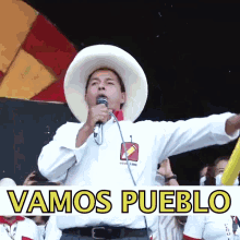 Pedro Castillo, wearing a white hat, speaks into a microphone and holds a large yellow pencil, rallying the crowd with "¡Vamos Pueblo!".