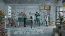 Pentagon members Jinho, Kino, Shinwon, Yuto, and Edwan perform a lively dance to their song 'Shine' in a practice room.