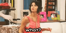 Selena Gomez looks surprised and asks 'what?' while sitting on a couch in a living room setting.