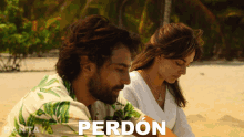 Maria Elisa Camargo and Sebastian Eslava on a beach, with the word 'Perdón' displayed, suggesting apology or forgiveness.