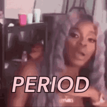 A woman with a serious expression and the word 'PERIOD' overlaid, making a strong statement.
