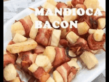 A compilation of delicious Brazilian appetizers including cassava with bacon, calabrese sausage with onion, meatballs with cassava, and cheesy bacon fries.