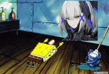 Spongebob Squarepants kneels in worship before the anime character Rosetta from Punishing: Gray Raven.