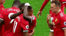 Phil Jones celebrates with his teammates on the soccer field, sharing smiles and embraces after a play.