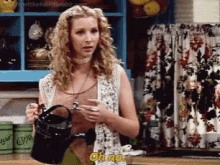 Phoebe Buffay (Lisa Kudrow) reacts with an 'Oh no' in the Friends kitchen, looking concerned.