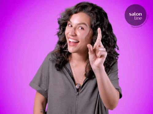 Kefera Buchmann winking and pointing, with a Salon Line logo in the background, reacting to a joke.