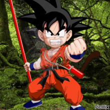 Goku from Dragon Ball Z, holding a red power pole, ready for action in a forest setting.