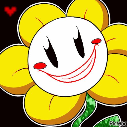 Flowey from Undertale, a yellow flower with a smiley face, red cheeks, and a red heart in the background.