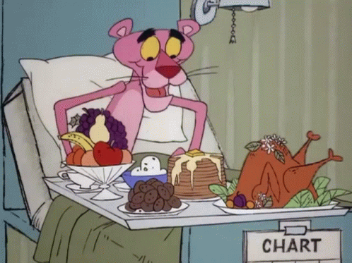 The Pink Panther, in a hospital bed, eyes a massive feast including turkey, pancakes, fruit, and dessert.