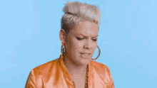 Pink makes a visibly confused and disgusted face, wearing an orange jacket and large hoop earrings.