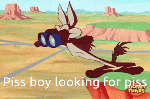 Wile E. Coyote, the 'Piss Boy', intently looking through binoculars for 'piss' in the desert.