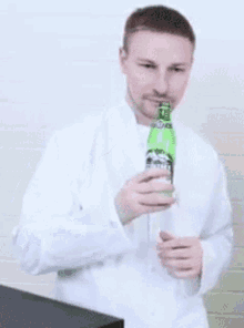 Kostya Pavlov drinks from a green bottle while wearing a white coat, then points at the camera.