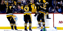 Pittsburgh Penguins players celebrate a goal, with player #53 Blüger being hugged by teammates, while an opposing Canucks player looks on.
