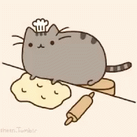 Pusheen the cat, wearing a chef's hat, playfully interacts with a pile of dough, ready for baking.