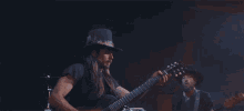 Lukas Nelson, wearing a top hat, passionately plays his electric guitar on stage during a live performance.