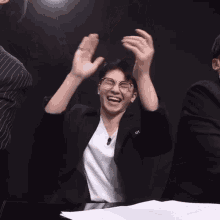 Woozi from Pocketeen Thinkabtwz laughs joyfully, throwing his hands up in excitement.