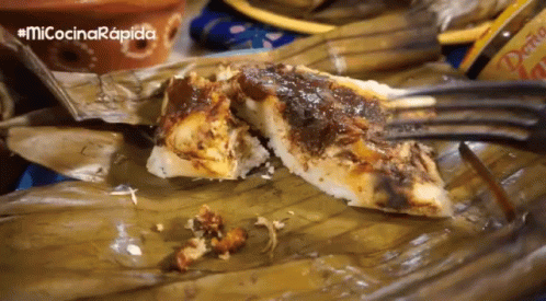 A delicious chicken dish, possibly tamales with mole sauce, being eaten with a fork.