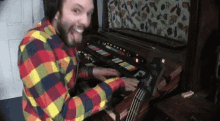 Jack Conte of Pomplamoose energetically plays a keyboard, wearing a colorful plaid shirt and headphones.