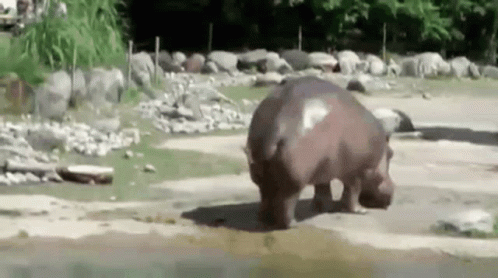Juliette Millet's hippo sprays feces with its tail while walking on a muddy path.