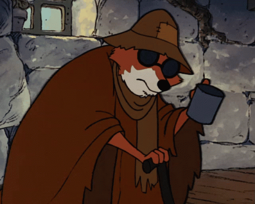 Animated fox character in sunglasses and hat, holding a mug, appearing to beg for alms.