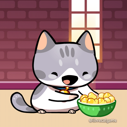 An adorable animated cat happily eats popcorn from a green bowl, with 'NOM NOM' text on screen.