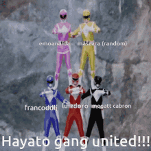Five Power Rangers in a pyramid formation with text 'Hayato gang united!!!' and various names.