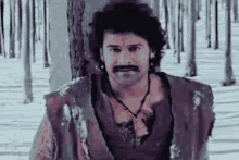Prabhas from Bahubali smiling happily in a snowy forest setting.