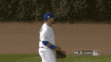 Kyle Schwarber, a baseball player for the Cubs, walks on the field with an MLB.com logo visible in the background.