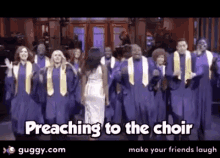 A lively choir in purple robes sings and claps, with the phrase 'Preaching to the choir' displayed.