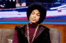 Prince, also known as Princerogersnelson, on a couch, reacting with a thoughtful expression, then closing his eyes, wearing a turtleneck and gold chain.