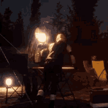 Prompto and Ignis from Final Fantasy XV at a nighttime campsite, illuminated by a bright lantern.